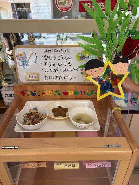 今日は令和7年7月7日 七夕です。 調理員も行事食として楽しい給食を提供してくれました。 今日のメニューは、星型のハンバーグ、オクラ入りのソーメンなど目でも楽しめる楽しいメニューで、おいしく食べることができました。