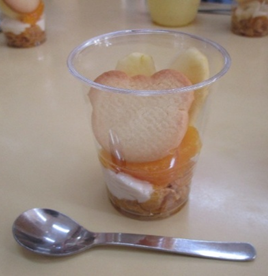 コーンフレークの上にヨーグルトをのせて、バナナやりんご、オレンジのフルーツをトッピング。仕上げは、【くま】【うさぎ】【チューリップ】の手作りクッキーから好きなものを選んでパフェの完成です。