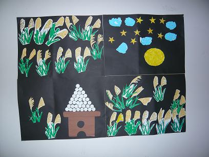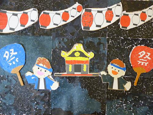 余暇活動にて、入居者の皆さんにより協同制作。ちぎり絵で『秋祭りの神輿の風景』を表現しました。