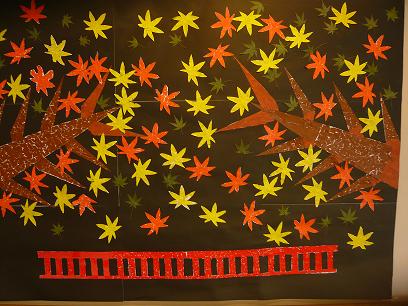 余暇活動にて、入居者の皆さんの協同制作。ちぎり絵で香嵐渓をイメージして、秋の風景を作りました。