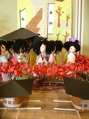 余暇活動にて、入居者の皆さんの協同制作。人形も入居者の皆さんの手作りです。表情がそれぞれ違い、作られた方の個性が出ています。