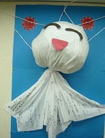 余暇活動にて、入居者の皆さんが協同制作で、巨大てるてる坊主を作成しました。