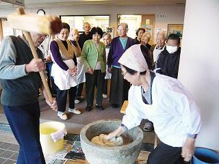 ケアハウスでは、年末の恒例行事として『もちつき会』を開催しています。男性入居者の方が、餅をつき、女性入居者の方が、「花餅」を作ってくださいました。