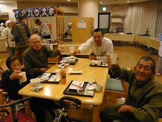 ケアハウスでは、年末の行事として夕食の時に「忘年会」を行っています。忘年会では、豪華な食事(今回はにぎり寿司)だけでなく、お酒も提供されます。皆さん、大盛り上がりでした。