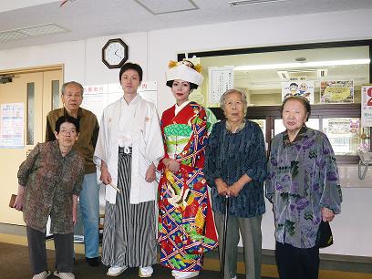 今年の渡し場祭りには、地元の新婚さんが、和装花嫁花婿の装いで、渡し船にのり、花嫁道中を行っています。毎年、花嫁、花婿の着付けを行う場所として当施設の部屋を貸し出しており、入居者の皆さんと、花嫁花婿さんと一緒に記念撮影をしました。