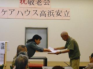 敬老会では、日頃、ケアハウスの環境整備にボランティアで協力していただいている方、余暇活動、クラブに多く参加されている方を表彰させていただきました。その後、授産所高浜安立に通っている授産生の方が、『落語』を披露して下さいました。