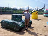 見学した利用者さんたちも、高校生のかっこいい応援合戦を見学し、とても楽しそうでしたよ。T君などは、高校生が作ったお気に入りの戦車の張りボテの前で、思わず最敬礼。戦車の説明をしてくれました。