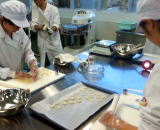 さて、アレルギー対応食品の製造に向けて、産官学協同のプロジェクトを進めていますが、今回は研究開発を進めていただいてる中部大学(春日井市)を訪問してきました。4グループに分かれた大学3年の学生さんたちが、授業後に夜遅くまで試作品を作ってくれていました。