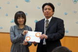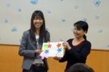 と言います。 この取り組みは、今回の震災からの復興は阪神淡路大震災以上に長期に渡るだろうという状況の中で、一回限りの取り組みでなく、必要としている子どもたちに、できる限り長期に渡って支援できる体制作りが必要だと考えるところから始まりました。。 その時に、愛知文教女子短期大学様より、学生さんたちが「ばりまる義援金」を集めるサークルを立ち上げてくださり、今後継続して募金活動をして授産所に「ぱりまる」を作る資金を送っていただき、授産所ではその義援金で心を込めて「ぱりまる」を作り、被災地に届けるというシステムです。今回も、前回同様に「アトピッ子地球の子ネットワーク(東京)」様などにお願いし、被災地の食物アレルギーの子どもたちに確実に届くルートを使わせていただきます。これは前回も利用させていただいた、被災地の医療機関を通して食物アレルギーの子どもたちに直接手渡していただくルートです。 今回は4名の可愛らしい学生さんと富田副学長、安藤教授の6名が来所され「ぱりまる義援金」と「メッセージカード」を贈呈していただきました。本当にありがたいことです。私たちは、若い学生さんたちの「ぱりまる」に託した熱い想いが、必ず東北に届くよう利用者さんと心を込めて作ります! みなさまの応援よろしくお願いします!