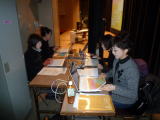 上の写真は、お手伝いしていただいた要約筆記のみなさんです。あのスクリーンに映すためには、舞台裏で4人の方が同時にPCに書き込んでみえました。本当にありがとうございました。右側の写真は会場ロビーでやらせていただいた福祉の店の様子です。地域の4つの福祉事業所に協力していただきました。沢山の方にお買い物をしていただき、心からお礼を申し上げます。