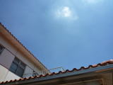 授産所の玄関先に出て、スカッと晴れ渡った青空を撮影してみました。 白い雲がまぶしいくらいでした。若いころは、海に山にと、夏の到来が待ち遠しかったものですが、これくらい年を取ると、肌を焦がすような太陽の日差しが、生命まで吸い取っていきそうで、ちょっとひるみますね。なんか、年くったなと実感させられました。