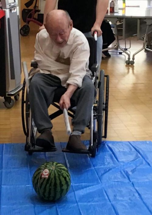 また夏と言えばスイカ割りも欠かせません。ご入居者とご家族が協力して、スイカを割っていただきました。 見事に割れたスイカは皆さまで美味しくいただきました。